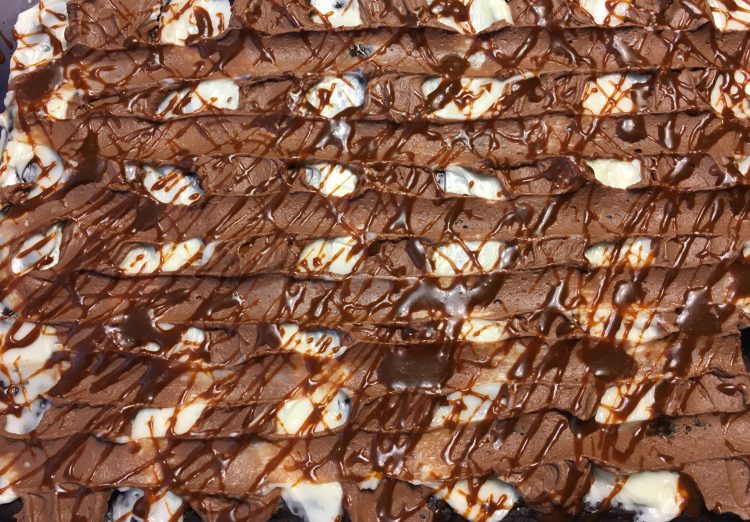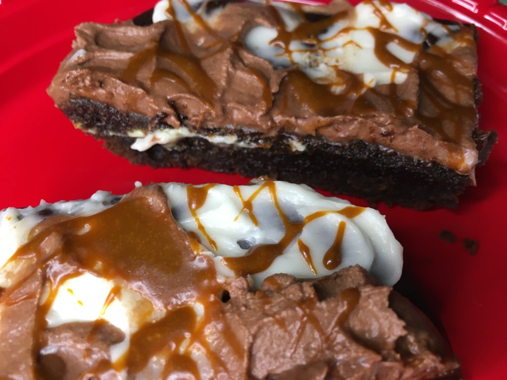 Preheat oven to 375 and grease 9×13″ pan. Mix spices into brownie mix then prepare according to package directions (or make from scratch – more power to ya!) Mix in pumpkin, pour into pan and bake 35-40 minutes, testing with toothpick after 35 minutes. Cool completely.