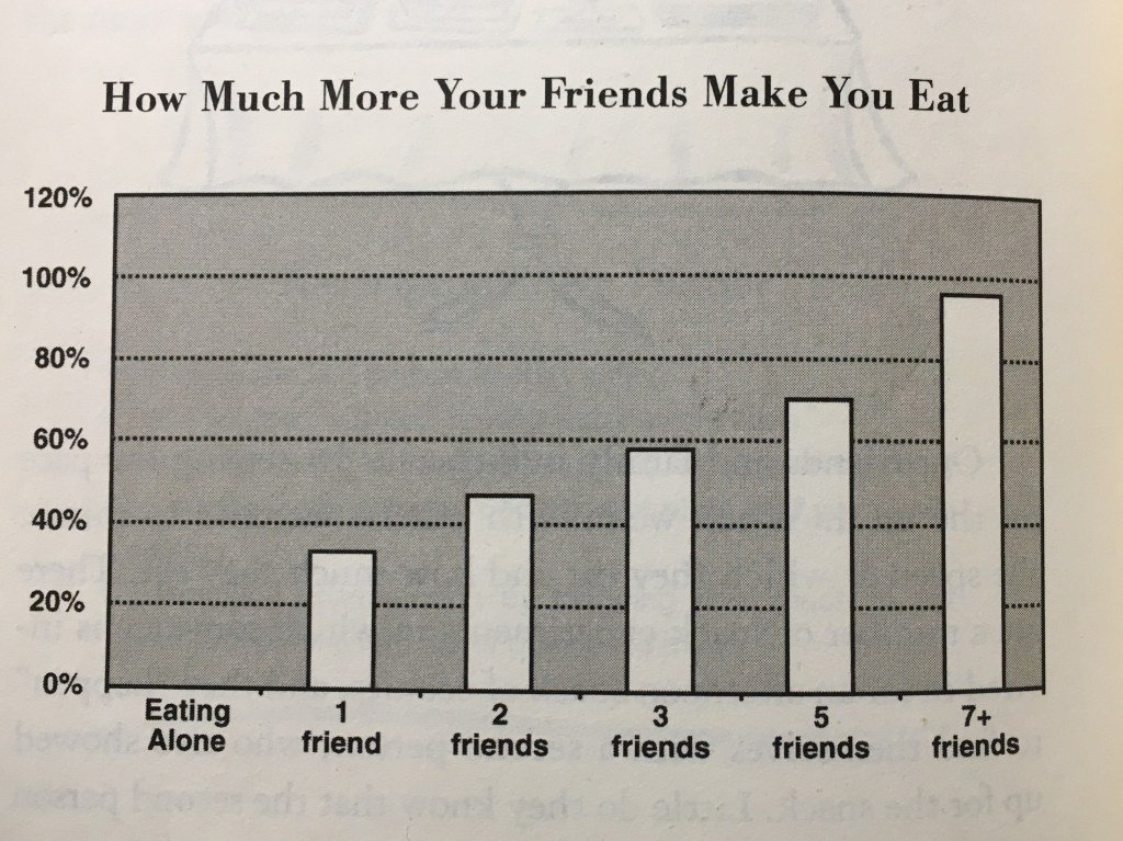 What does this mean? If you’re trying to control your weight, sit with the slow eaters or the light eaters. They will help you pace yourself and resist the temptation to gorge. Eat slowly and savor your meal and the company!