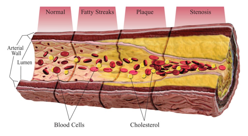 FIRST – Fat Builds Up. THEN – Cholesterol Gets Stuck and forms Plaque. UNTIL – Blood Flow is Restricted. This can lead to heart attack or stroke.
