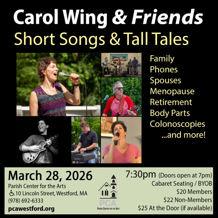 Short Songs and Tall Tales Posted byCarol WingApril 1, 2026Posted inSINGTags:Parish Center for the Arts, PCA, short songs, tall tales This event was SOLD OUT! Thanks for helping to raise almost $2,000 for the Westford Parish Center for the Arts!!! If you couldn’t make it to the show, you can watch it here! Share this site: Email a link to a friend (Opens in new window) Email Share on Facebook (Opens in new window) Facebook Share on Pinterest (Opens in new window) Pinterest Share on X (Opens in new window) X Share on WhatsApp (Opens in new window) WhatsApp Like Loading... Related