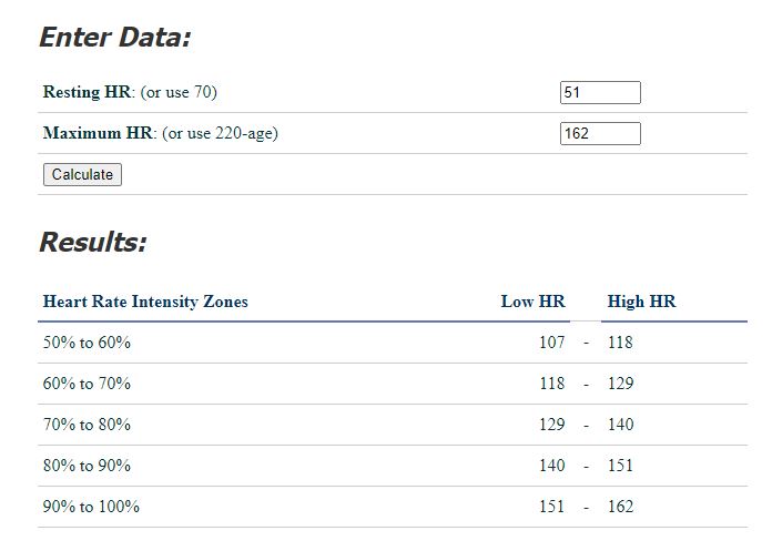 Here is a sample that I made for myself with the online calculator. It gives my target heart range for each zone, which is quite handy once I know which Zones I want to work in! I might use different Zones for different workouts too.